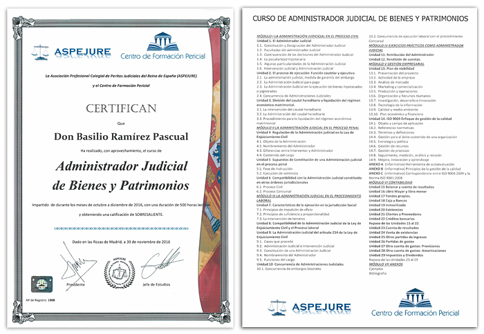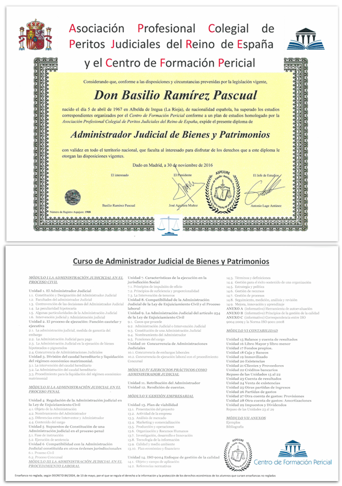 Como todos los que me conocen saben, yo siempre he considerado que la carrera dura toda la vida y siguiendo ese compromiso que he disfrutado y que aconsejo a cualquier profesional para seguir vivo e ilusionado, en noviembre de 2016, he completado mi formación con la superación del CURSO SUPERIOR universitario de Administrador Judicial de Bienes y Patrimonios que he realizado en la Universidad Rey Juan Carlos, con una duración de 500 horas lectivas y obteniendo una calificación de sobresaliente.