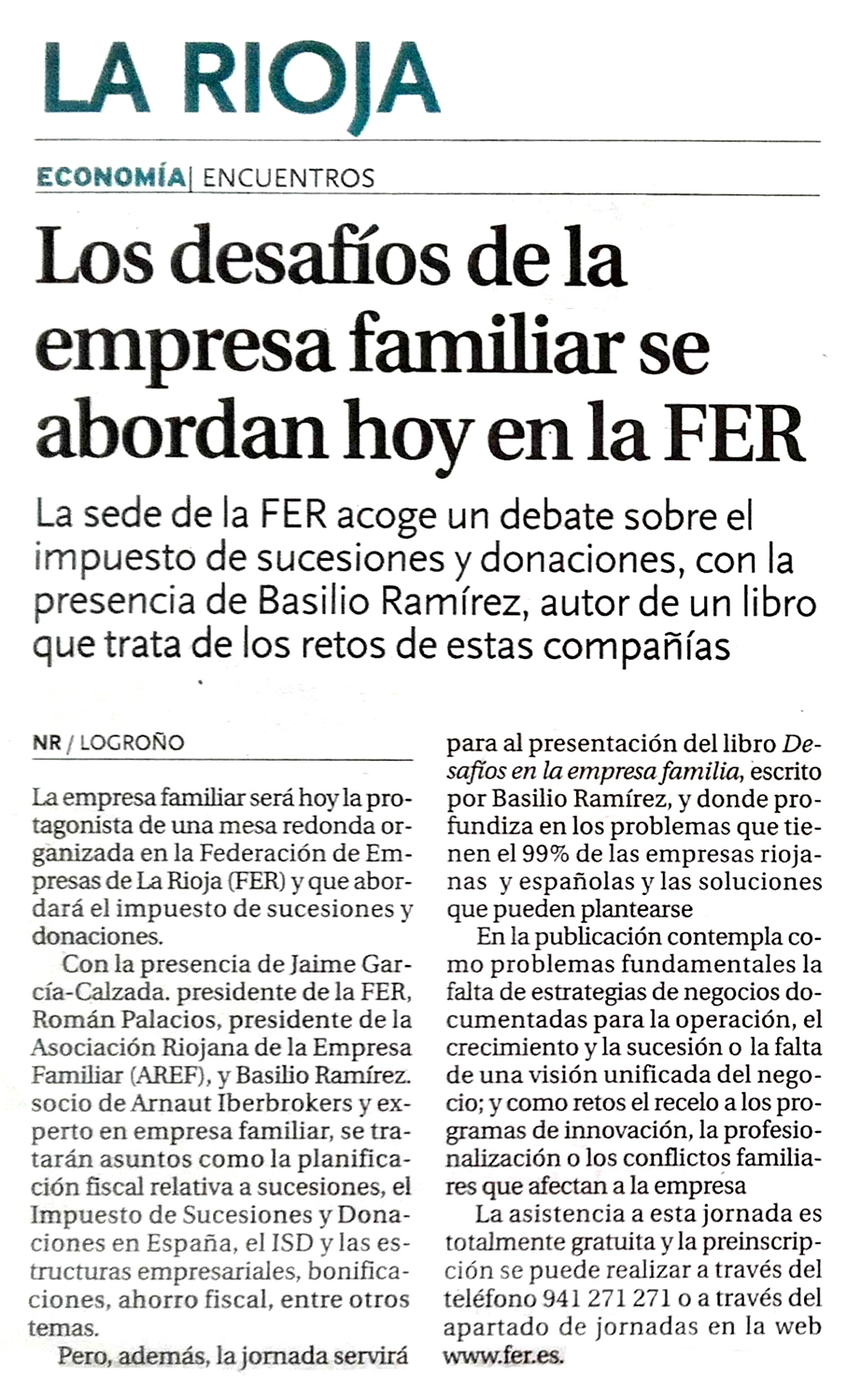 Este mismo libro, ya presentado en Madrid, ha tenido su puesta de largo en La Rioja con la participación de las organizaciones empresariales FER y AREF (Asociación Riojana de la Empresa Familiar).
